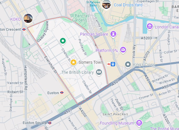 Somers Town is a historic and culturally vibrant area in Central London, located within the London Borough of Camden. Nestled between Euston, St. Pancras, and King's Cross railway stations, Somers Town has a rich history and a distinct character influenced by its diverse community.